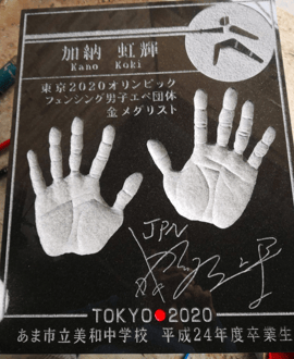 あま市出身の2020TOKYOフェンシングエペ団体での金メダリスト加納虹輝選手の手形を施した石版を制作、あま市内の4箇所に設置されました。